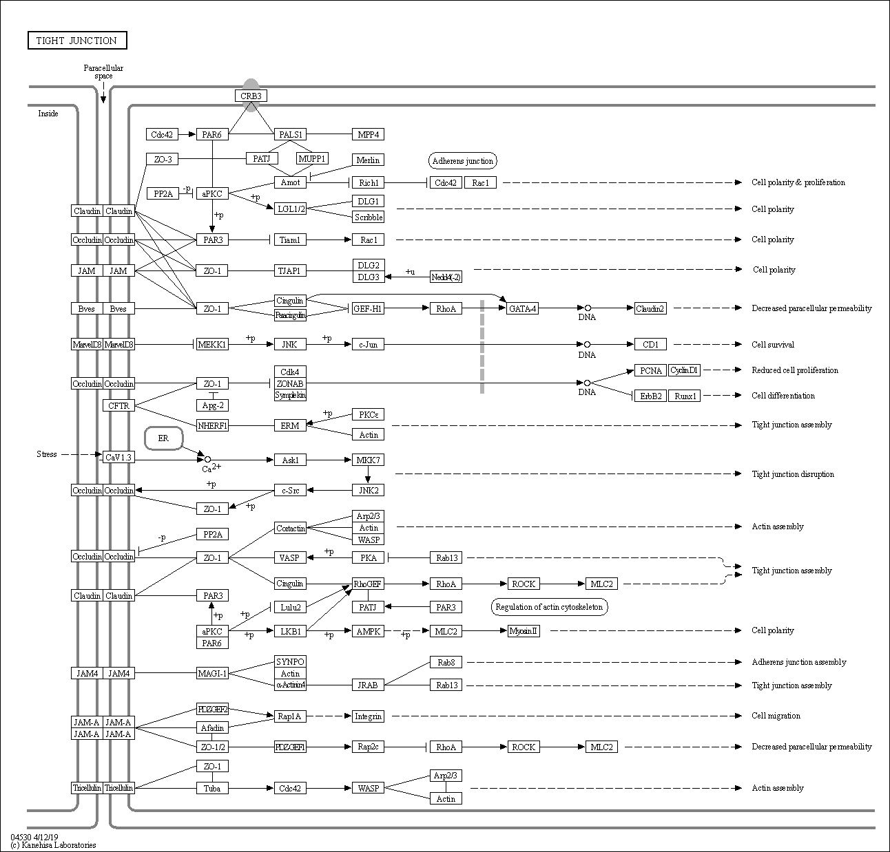 紧密连接将相邻的上皮细胞密封在一起,阻止大多数溶解分子以及膜结合脂质和蛋白质在顶端和基底外侧表面之间通过。保持紧密连接上皮细胞的这种分离在环境和哺乳动物有机体内部或内部隔间之间形成屏障。一些例子包括血脑屏障、血管、肠道、肾单位和皮肤。组织和器官系统的发育需要正确形成紧密连接。正常的生物过程,如免疫细胞外渗/渗出和肠道吸收,需要正确组装、拆卸和维持紧密连接。紧密连接完整性和功能的失调在炎症性肠病和肿瘤转移期间上皮间质转化等疾病的病理生理学中起着关键作用。紧密连接的核心成分包括claudins、ocludin和其他细胞粘附蛋白。它们的胞外域与其他细胞表面蛋白进行同源和/或异嗜性相互作用,而它们的胞内域与衔接蛋白(如肌动蛋白、连环蛋白和其他连接相互作用蛋白)相互作用。