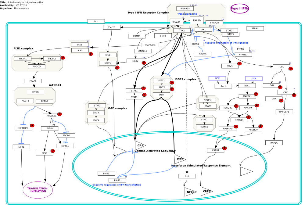 I型IFN(IFNα家族,IFNβ,IFNω,IFNε和IFNκ)均与I型IFN受体复合物结合并通过其发出信号。I型受体由两个主要的IFNAR1,IFNAR2c受体链和其他辅助蛋白组成。通路图描述了I型干扰素信号传导途径,并显示了通过JAK-STAT途径的经典IFN信号传导和其他非经典IFN信号传导途径。