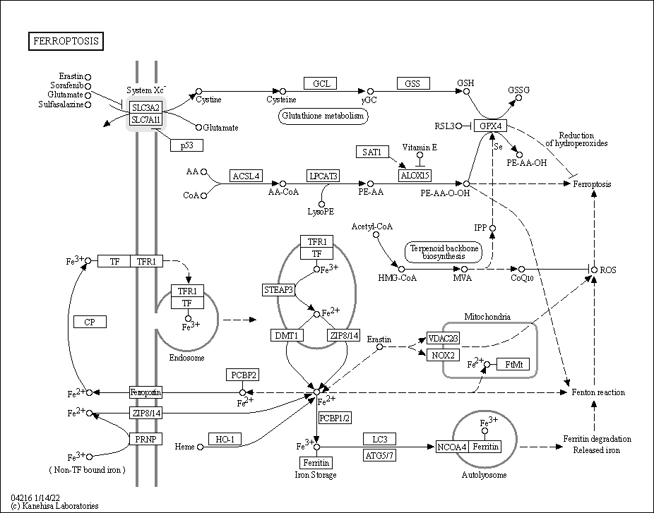 参与铁死亡过程包括线粒体电压依赖性阴离子通道和丝裂原活化蛋白激酶的激活、内质网应激的上调和胱氨酸/谷氨酸逆向转运蛋白的抑制。该过程的特点是脂质过氧化产物和来自铁代谢的致死活性氧 (ROS) 的积累,并且可以通过铁螯合剂和脂质过氧化抑制剂。GPX4、HSPB1和NRF2分别通过限制 ROS 产生和减少细胞铁摄取来作为铁死亡的负调节因子。相比之下,NOX和 P53分别通过促进 ROS 产生和抑制 SLC7A11的表达而作为铁死亡的正调节剂。铁死亡调节异常与多种生理和病理过程有关,包括癌细胞死亡、神经毒性、神经退行性疾病、急性肾功能衰竭、药物诱导的肝毒性、肝和心脏缺血/再灌注损伤和 T 细胞免疫。
