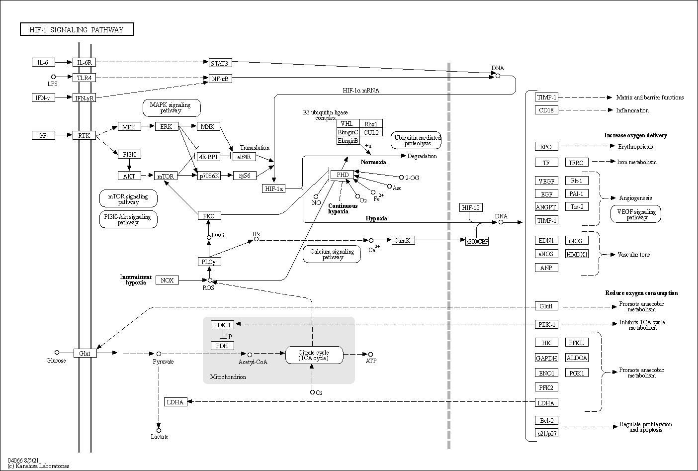缺氧诱导因子1(HIF-1)是一种转录因子,是氧稳态的主要调节因子。它由两个亚单位组成:一个诱导表达的HIF-1alpha亚单位和一个组成性表达的HIF-1beta亚单位。在常氧条件下,HIF-1α在特定脯氨酰残基处发生羟基化,导致亚单位立即泛素化和随后的蛋白酶体降解。相反,在缺氧条件下,HIF-1α亚单位变得稳定,并与p300/CBP等共激活因子相互作用,以调节其转录活性。最终,HIF-1在缺氧条件下充当许多缺氧诱导基因的主调节器。HIF-1的靶基因编码增加O2输送并介导对O2剥夺的适应性反应的蛋白质。尽管名为HIF-1,但其诱导不仅是对氧可用性降低的反应,而且是由其他刺激物(如一氧化氮或各种生长因子)诱导的。