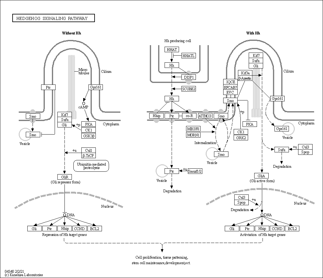进化上保守的 Hedgehog (Hh) 通路对于正常胚胎发育至关重要,在控制细胞增殖、组织模式、干细胞维持和发育中具有多种作用。初级纤毛是脊椎动物中刺猬信号转导的重要中心。在 Hh 不存在的情况下,Ptch 受体定位于纤毛,在抑制 Smo 激活。 Gli 蛋白被 PKA、CKI 和 GSK3B 磷酸化,并部分降解为截短的 Gli 阻遏物形式 (GliR),抑制 Hh 靶基因在细胞核中的转录。在 Hh 的存在下,Ptch 从纤毛中消失,激活的 Smo 有助于蛋白质复合物 Gli、Sufu、Kif7 易位至纤毛尖端,其中 Gli 与负调节剂 Sufu 分离。发生 Gli 激活剂形式 (GliA) 的产生,并且 GliA 的核积累增加导致 Hh 靶基因的激活转录。异常的 Hh 信号传导还导致越来越多的癌症的发生,包括经典的基底细胞癌、成神经管细胞瘤和横纹肌肉瘤。了解控制 Hh 通路活性的机制将为开发新疗法以治疗越来越多的 Hh 驱动的病理提供信息。