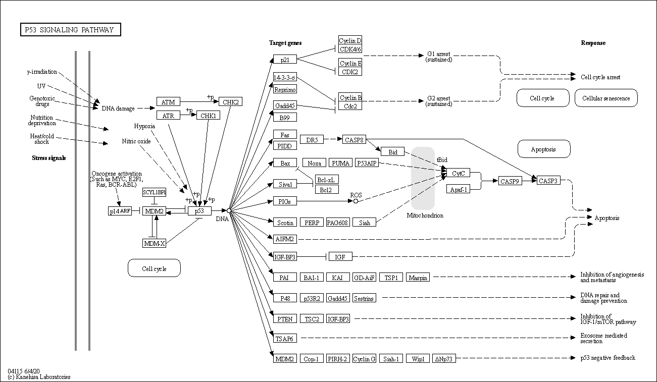 p53激活是由许多应激信号诱导的,包括DNA损伤、氧化应激和活化的癌基因。p53蛋白用作p53调节基因的转录激活因子。这导致了三个主要产出;细胞周期停滞、细胞衰老或凋亡。其他p53调节的基因功能与相邻细胞沟通,修复受损的DNA或建立正负反馈回路,增强或减弱p53蛋白的功能,并将这些应激反应与其他信号转导途径整合。
