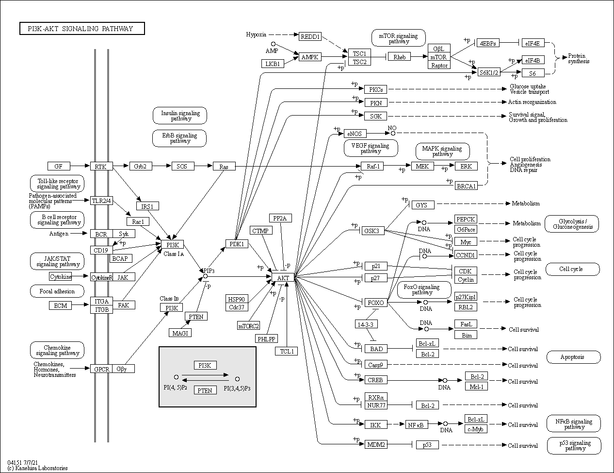 PI3K-Akt信号通路被多种细胞类型刺激或毒性损伤激活,并调节转录、翻译、增殖、生长和存活等基本细胞功能。生长因子与其受体酪氨酸激酶(RTK)或G蛋白偶联受体(GPCR)的结合分别刺激Ia类和Ib类PI3K亚型。PI3K催化细胞膜上磷脂酰肌醇-3,4,5-三磷酸(PIP3)的生成。PIP3反过来充当第二个信使,帮助激活Akt。一旦激活,Akt可以通过磷酸化参与凋亡、蛋白质合成、代谢和细胞周期的底物来控制关键的细胞过程。